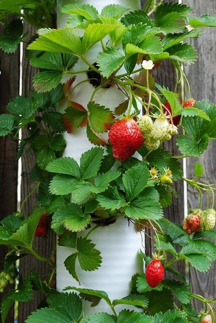 Drill holes into a vertical PVC pipe, fill it with soil, and plant strawberries through the openings for a modern, space-efficient solution.
