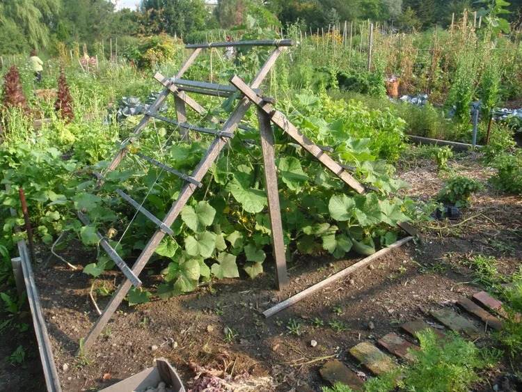 An A-frame trellis made from wood or bamboo is sturdy and ideal for supporting heavy cucumber vines. It also allows easy access from both sides.