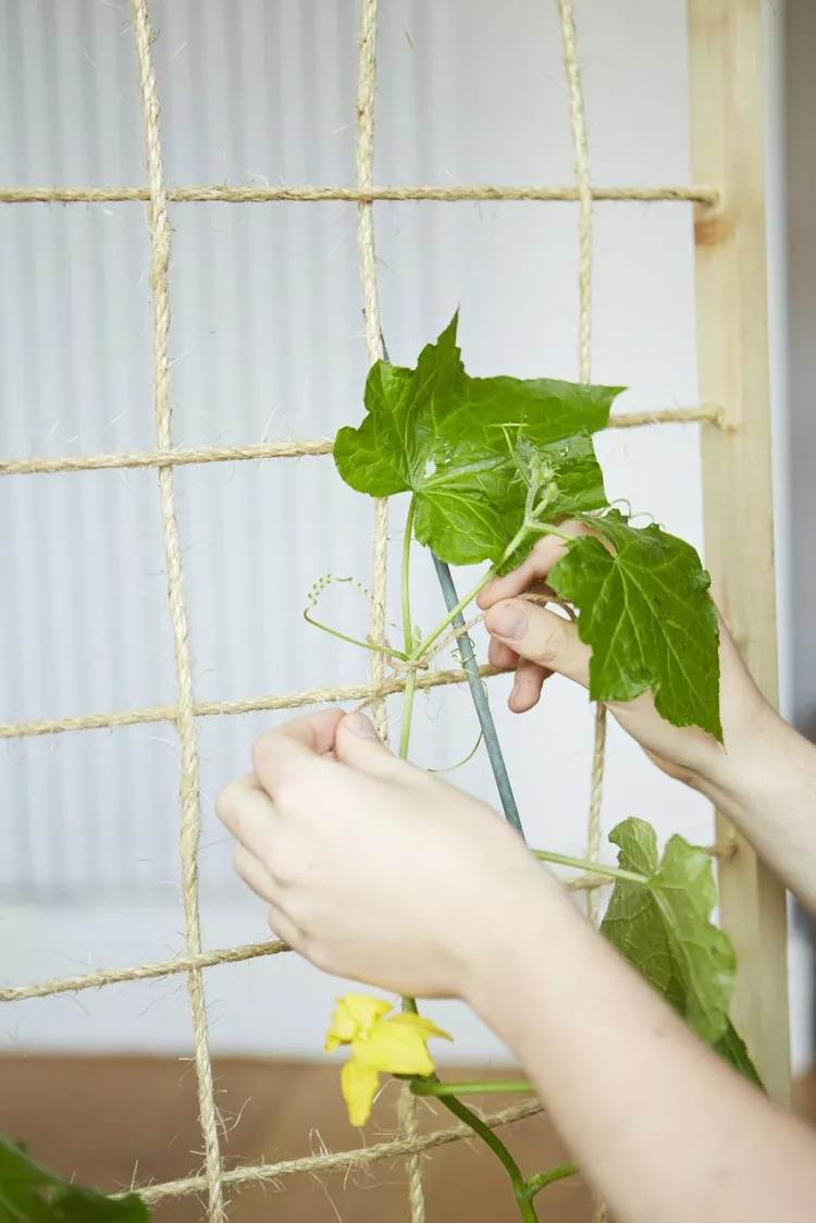 Attach garden twine from the soil to an overhead frame. This simple setup encourages cucumbers to climb naturally.