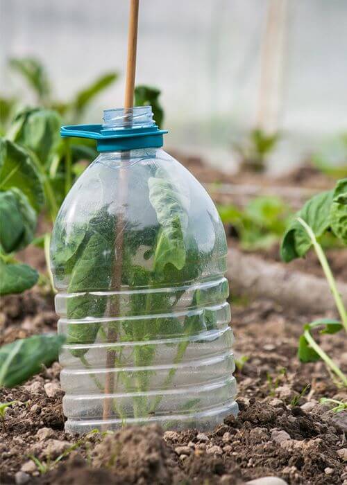 Place clear bottles over young plants to protect them from wind, pests, and cold weather.