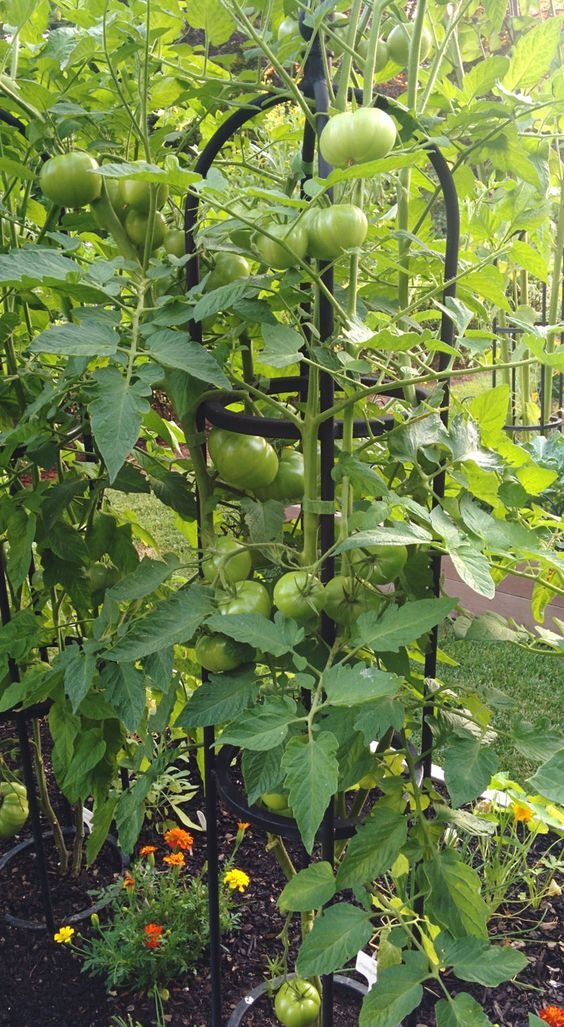 Large tomato cages can be repurposed for cucumbers, peas, or flowering vines. -