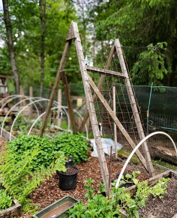 An A-frame design offers stability and support for multiple plants growing on both sides. -