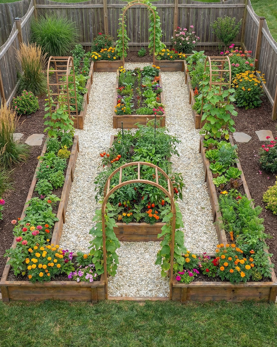 This type of raised bed layout is designed to get the most growing space out of a compact footprint while keeping everything easy to reach, easy to maintain, and pleasant to walk through. It works just as well for vegetables, flowers, or a mix of both.