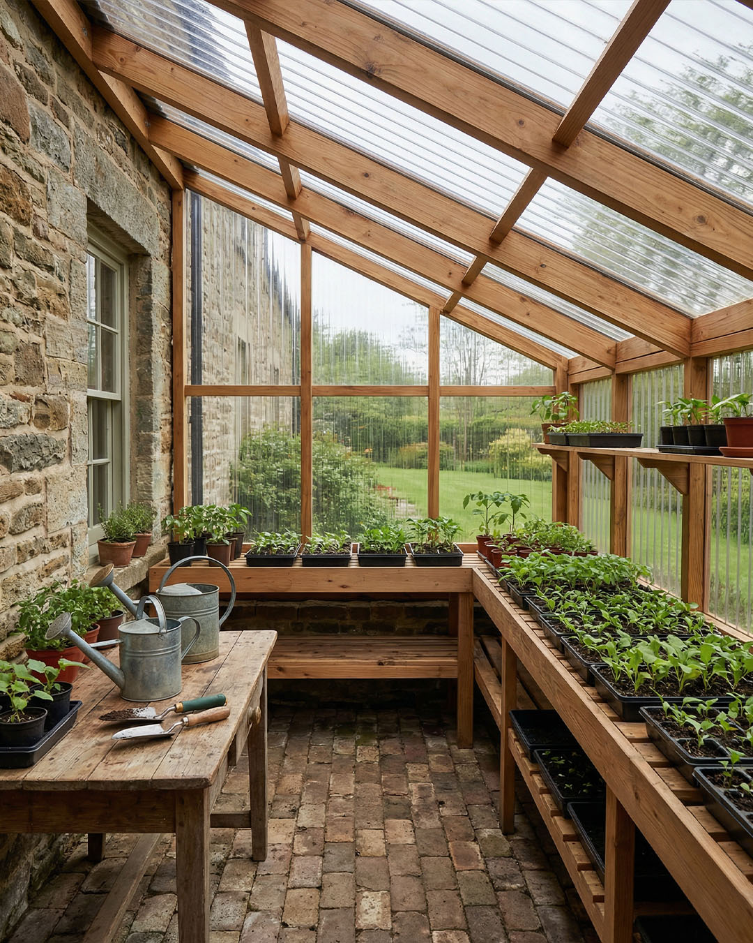 Inside, trays of young seedlings line the benches and raised beds, creating an organized, productive space that stays sheltered from wind and sudden temperature changes.