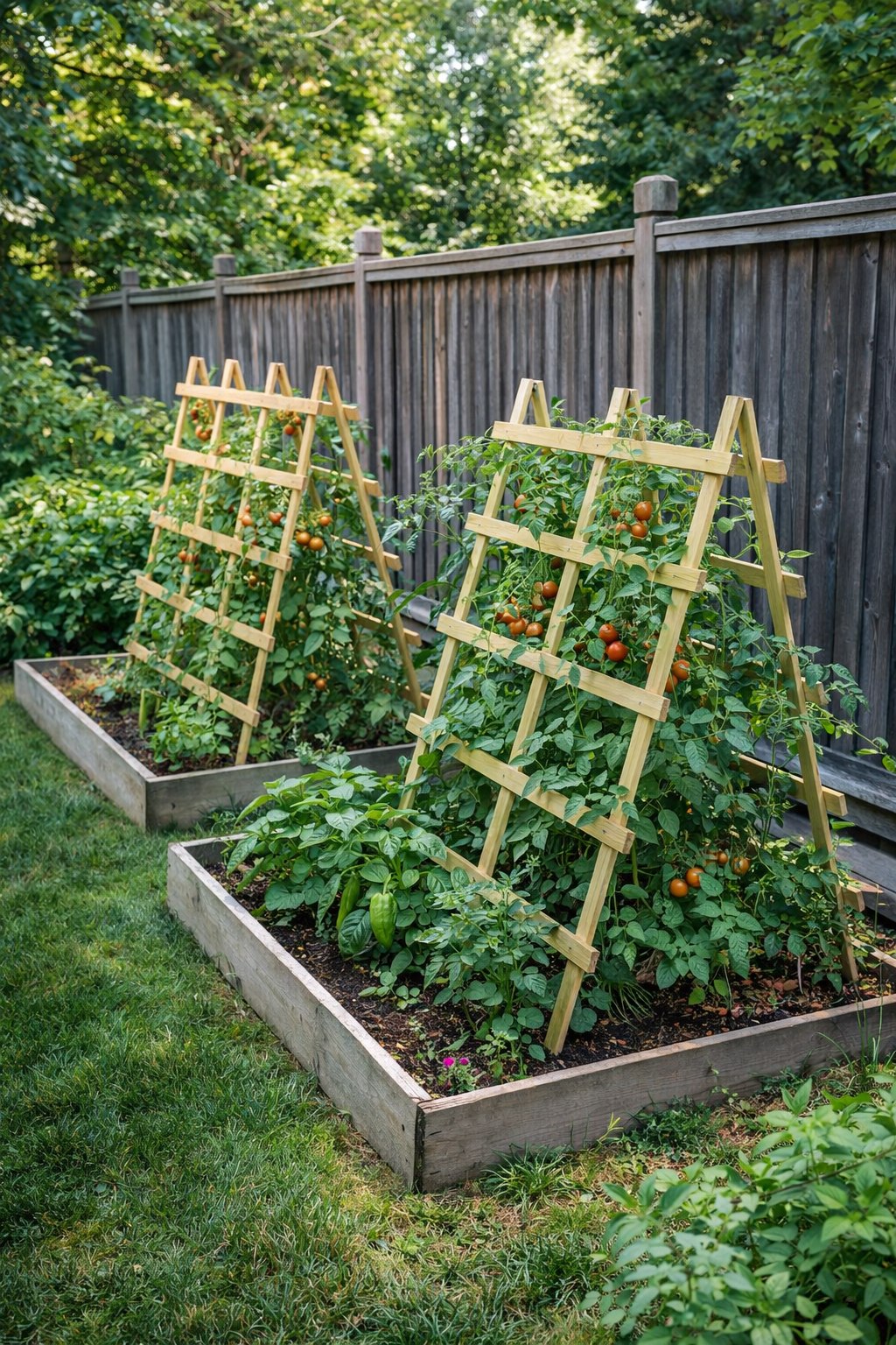 Trellises That Maximize Vertical Space Simple wooden trellises lean gently within the beds, supporting climbing plants like tomatoes, beans, or peas.