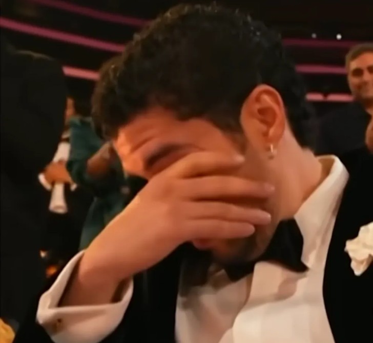 Bad Bunny reacts to winning Album of the Year for “DeBÍ TiRAR MáS FOToS” during the 68th Annual Grammy Awards at Crypto.com Arena on February 1, 2026