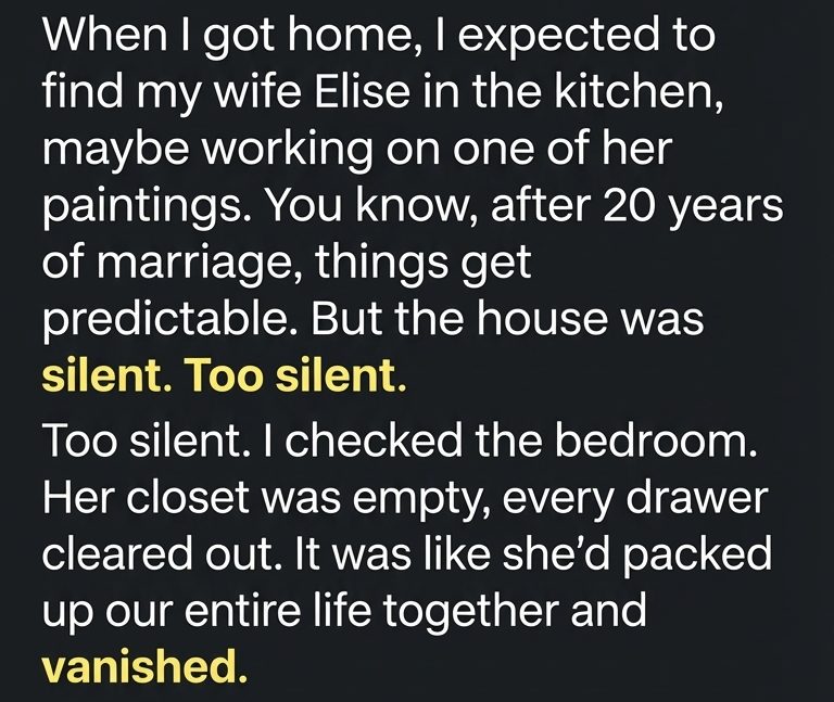 My footsteps echoed through the house as I searched room by room, my heartbeat drowning out everything else. The bedroom told the rest of the story. Elise’s closet gaped open, and empty hangers swayed slightly from the air conditioning.