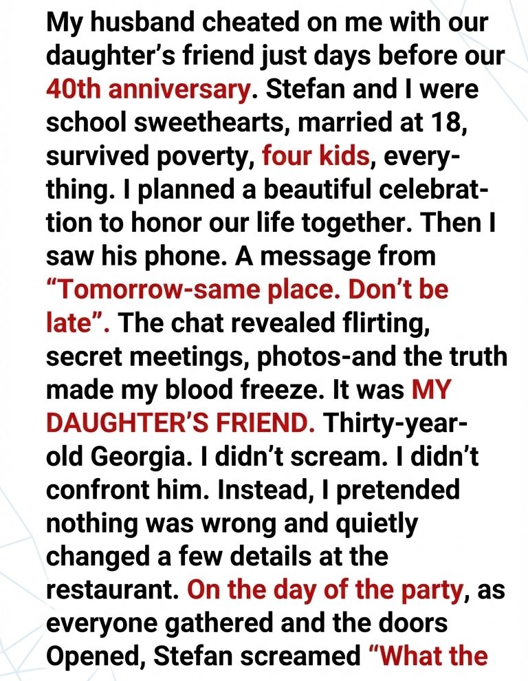 Days before our 40th anniversary celebration, I found flirty messages on my husband’s phone from my daughter’s best friend. What I felt went beyond heartbreak. Instead of confronting him, I planned something he’d never forget.