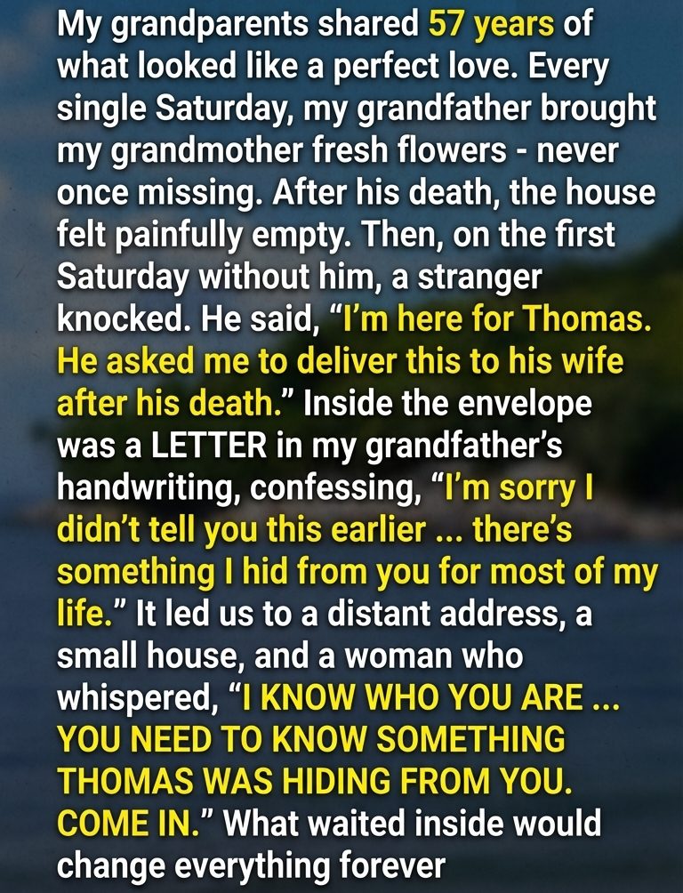 Grandpa had written. My grandma was terrified the whole drive, and what we found left us both in tears. I never imagined I’d witness a love story as moving as the one my grandma lived. But after my grandpa died, something unexpected happened, and this is how their story continued. My grandparents were married for 57 years. Their love wasn’t loud or dramatic. It was the kind that existed in small, consistent gestures that added up to a lifetime. After my grandpa died, something unexpected happened. Every Saturday morning, my grandfather, Thomas, would wake up early, slip out of bed while Grandma Mollie was still sleeping, and come home with fresh flowers. Some days, they were wildflowers he’d picked from the roadside. Other times, tulips from the farmer’s market. And often, roses from the florist in town. They were always there, waiting in a vase on the kitchen table when Grandma woke up. I remember asking him once when I was little, “Grandpa, why do you bring Grandma flowers every single week?” He smiled at me, that gentle smile that made his eyes crinkle at the corners. “Because love isn’t just something you feel, Grace. It’s something you do. Every single day.” They were always there, waiting in a vase on the kitchen table. “But it’s just flowers.” “It’s never just flowers, dear. It’s a reminder that she’s loved. That she matters. That even after all these years, I’d still choose her.” Their love didn’t need grand declarations. Just petals, and time. I grew up watching this ritual. Even on the Saturdays when Grandpa wasn’t feeling well, he still brought those flowers. Sometimes I’d drive him to the market, and he’d spend 20 minutes choosing the perfect bouquet. Grandma would always act surprised when she saw them, even though she knew they’d be there. She’d smell them, arrange them just so, and kiss his cheek. “You spoil me, Thomas,” she’d say. “Not possible,” he’d reply. Their love didn’t need grand declarations. A week ago, Grandpa Thomas passed away. He’d been sick for months, though he never complained. Cancer, the doctors said. It had spread quietly, the way some things do when you’re not paying attention. Grandma held his hand until his very last breath. I was there too, sitting on the other side of the bed, watching the man who’d taught me what love looked like slip away. When he was gone, the silence in that room was deafening. *** The days after the funeral blurred together. I stayed with Grandma to help her sort through things. His books. His clothes. The reading glasses he always left on the nightstand. He’d been sick for months, though he never complained. The house felt wrong without him. It was too quiet and hauntingly still. And for the first time in 57 years, Saturday morning came without flowers. Grandma sat at the kitchen table, staring at the empty vase. I made her tea, but she didn’t drink it. She just kept looking at that vase like it was supposed to hold more than water. “It’s strange,” she said softly. “How much you can miss something so small.” I reached across the table and squeezed her hand. “He loved you so much, Grandma.” “I know, dear. I just wish I could tell him one more time that I loved him, too.” For the first time in 57 years, Saturday morning came without flowers. The following Saturday, there was a knock at the door. I wasn’t expecting anyone. Grandma looked up from her tea, confused. I opened the door to find a man in a long coat standing on the porch. He was holding a bouquet of fresh flowers and a sealed envelope. My heart skipped. “Good morning,” he said gently. “I’m here for Thomas. He asked me to deliver this to his wife after his death.” My hands started trembling. “What?” “I’m sorry for your loss,” the man said. He handed me the flowers and the envelope, then turned and walked back to his car without another word. He was holding a bouquet of fresh flowers and a sealed envelope. I stood there, frozen, holding the bouquet like it might disappear if I moved too fast. “Grace?” Grandma called from inside. “Who was it?” I walked back into the kitchen, barely able to speak. “Grandma, these are for you.” She looked at the flowers, and her face went white. “Where did those come from?” “A man. He said Grandpa asked him to deliver them. After he died.” Her hands flew to her mouth as I handed her the envelope. She stared at it for a long moment before opening it. Her fingers shook so badly I thought she might drop it. I stood there, frozen, holding the bouquet like it might disappear. She read it aloud, her voice breaking. “I’m sorry I didn’t tell you this earlier, darling. There’s something I hid from you for most of my life, but you deserve to know the truth. You urgently need to go to this address…” Grandma stared at the address written at the bottom of the letter. “What do you think it is?” I asked. “I don’t know,” she whispered. Then her face crumpled. “Oh God, Grace. What if… what if there was someone else?” “Grandma, no. Grandpa would never…” “But why would he hide something from me?” Her voice rose with panic. “For most of his life, he said. What does that mean?” Grandma stared at the address written at the bottom of the letter. I grabbed her hands. “We’ll figure it out together. Whatever it is.” “What if I don’t want to know?” she said, tears streaming down her face. “What if it ruins everything?” “It won’t. Grandpa loved you. You know that.” But even as I said it, doubt crept into my mind. *** We drove in silence. Grandma clutched the letter in her lap, her hands stiff with worry. I kept glancing at her, watching her jaw clench and release. “Maybe we should turn around,” she said suddenly. “Maybe I don’t need to know.” “What if it ruins everything?” “Grandma…” “What if he had another family, Grace? What if all those Saturdays h
