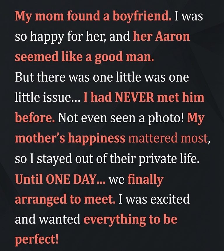 As I grew older, I often encouraged my mom to find someone new. She admitted she felt lonely, especially during those long, quiet evenings when the house seemed too big for one person. So, when she called me one afternoon, her voice bubbling with excitement as she announced that she had a boyfriend she wanted me to meet, I was genuinely happy for her.