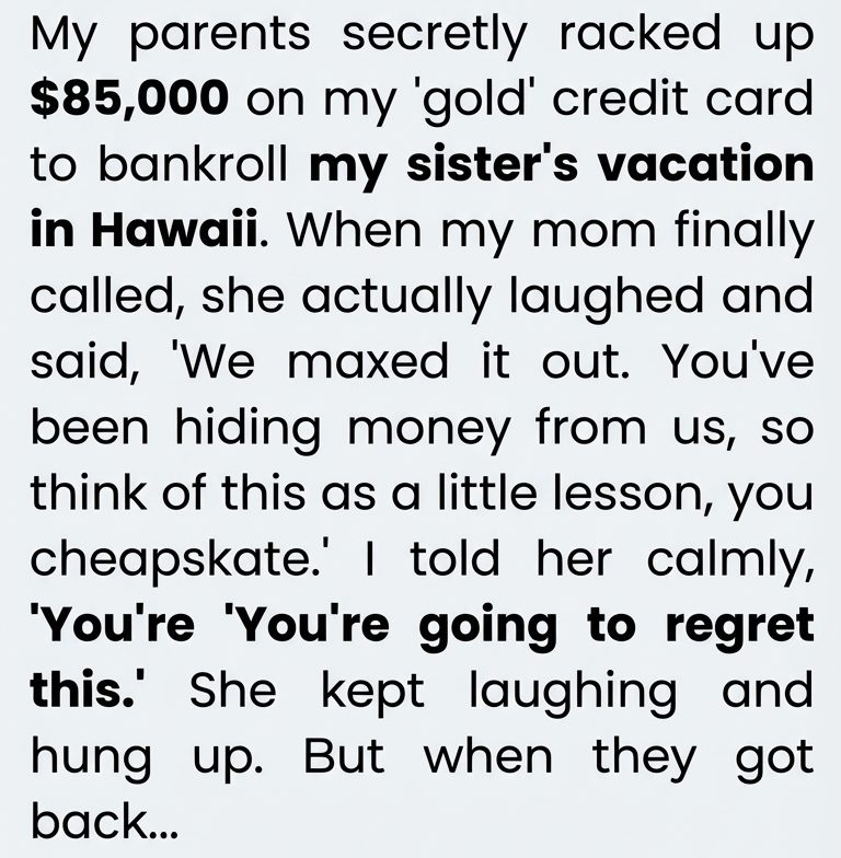 “My parents secretly racked up $85,000 on my ‘gold’ credit card to bankroll my sister’s vacation in Hawaii. When my mom finally called, she actually laughed and said, ‘We maxed it out. You’ve been hiding money from us, so think of this as a little lesson, you cheapskate.’ I told her calmly, ‘You’re going to regret this.’ She kept laughing and hung up. But when they got back…”