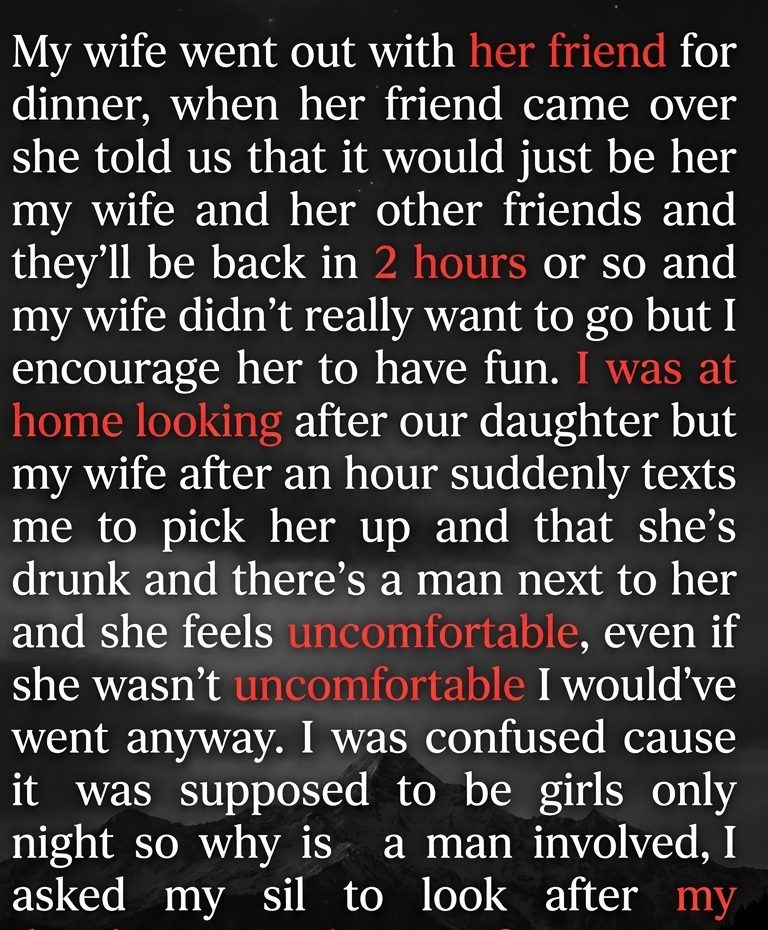 “All good,” I said smoothly, helping my wife stand up and grabbing her coat. “But I’m going to take her home. She’s a bit of a lightweight and really hasn’t had alcohol in forever, so it hit her pretty hard tonight. Have a good evening, guys.”